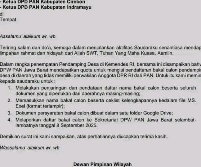 Surat bernomor PAN/10/A/K-S/070/VIII/2025 tertanggal 29 Agustus 2025 itu berisi perintah kepada Ketua DPD PAN Kabupaten Cirebon dan Ketua DPD PAN Kabupaten Indramayu untuk melakukan penjaringan bakal calon pendamping desa yang akan ditempatkan di bawah Kementerian Desa, Pembangunan Daerah Tertinggal, dan Transmigrasi (Kemendes RI).