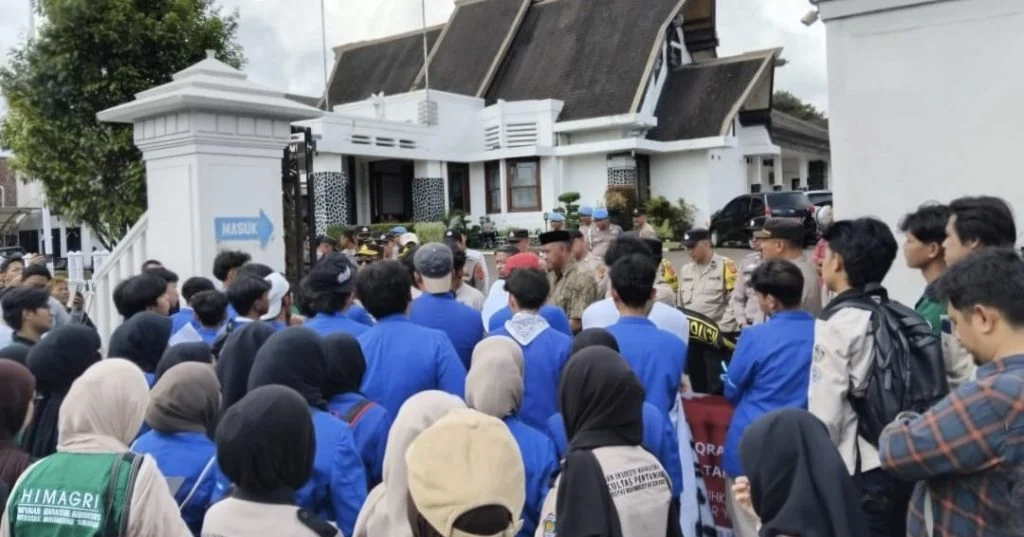 Teropongistana.com Sukabumi – Puluhan mahasiswa yang tergabung dalam BEM Fakultas Pertanian Universitas Muhammadiyah Sukabumi (UMMI) dan Keluarga Besar Mahasiswa (KBM) Fakultas Pertanian UMMI menggelar aksi unjuk rasa di Balai Kota Sukabumi, Jumat (12/12/2025). Mereka menyoroti buruknya sistem drainase yang dinilai menjadi salah satu penyebab banjir besar beberapa waktu lalu.
