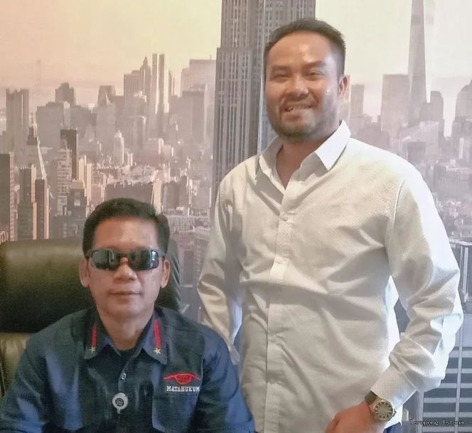 Keterangan foto : Sekjen Matahukum Mukhsin Nasir menggunakan baju biru, Senin (13/4/2026) Perbesar