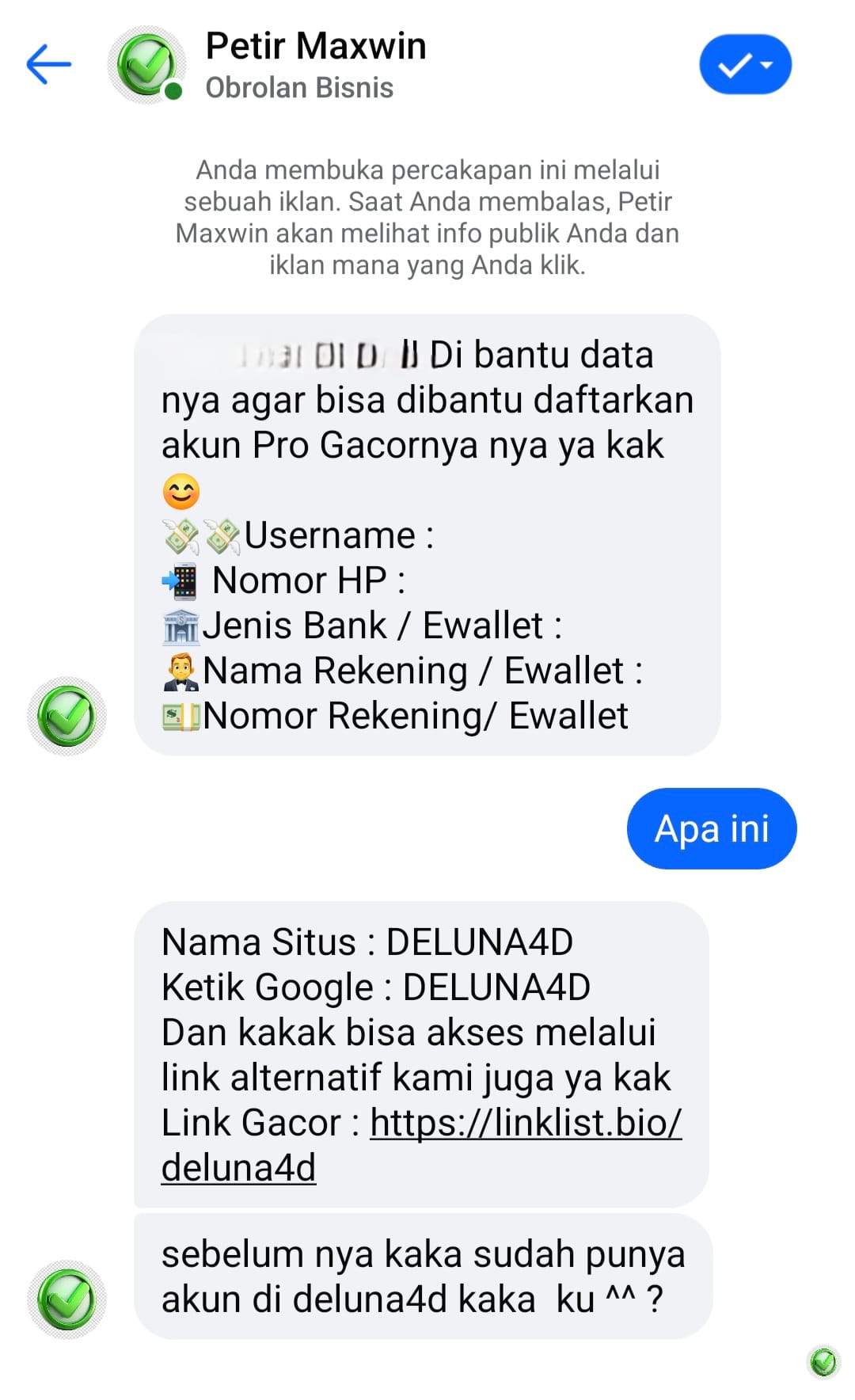 Salah satu kasus yang mencuat adalah keberadaan akun Facebook bernama Petir Maxwin yang diduga mengirim pesan pribadi kepada pengguna melalui Messenger. Dalam pesan tersebut, akun tersebut menawarkan pendaftaran di situs judi online bernama DELUNA4D, lengkap dengan tautan alternatif yang berpotensi menjebak masyarakat, Jakarta, 5 September 2025.