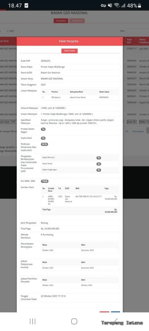 Berdasarkan dokumen resmi pengadaan yang beredar, BGN melalui skema e-purchasing merencanakan pembelian printer dengan harga Rp12 juta per unit, sehingga total pagu anggaran mencapai puluhan miliar rupiah.