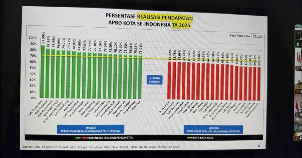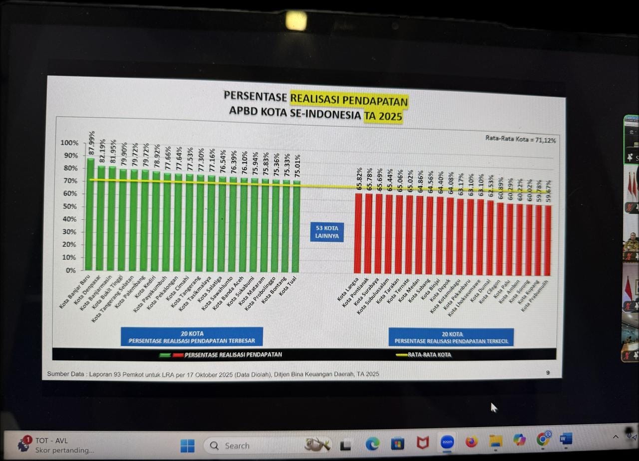 (APBD) 2025 sebesar 70,08%. Penghitungan tersebut tertuang dalam laporan 93 pemerintah kota untuk Laporan Realisasi Anggaran per 17 Oktober 2025 yang diolah datanya oleh Ditjen Bina Keuangan Daerah, Tahun Anggaran (TA) 2025.