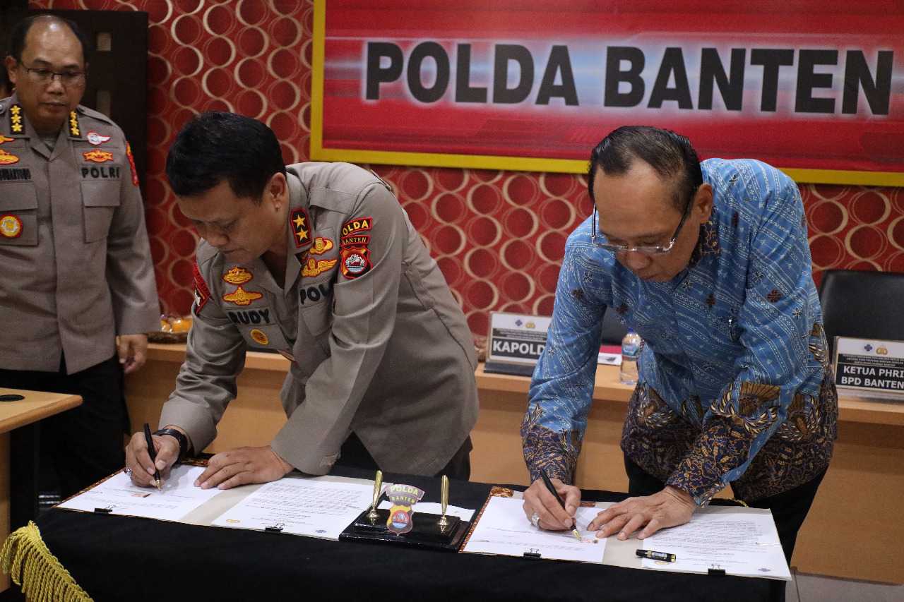 Penandatanganan perjanjian kerjasama ditanda tangani oleh Kapolda Banten Irjen Pol Dr Rudy Heriyanto dan ketua PHRI BPD Banten H. Achmad Sari Alam dihadiri oleh Wakapolda Banten Drs. Ery Nursatari beserta para PJU Polda Banten dan para pemilik Hotel dan Restoran.