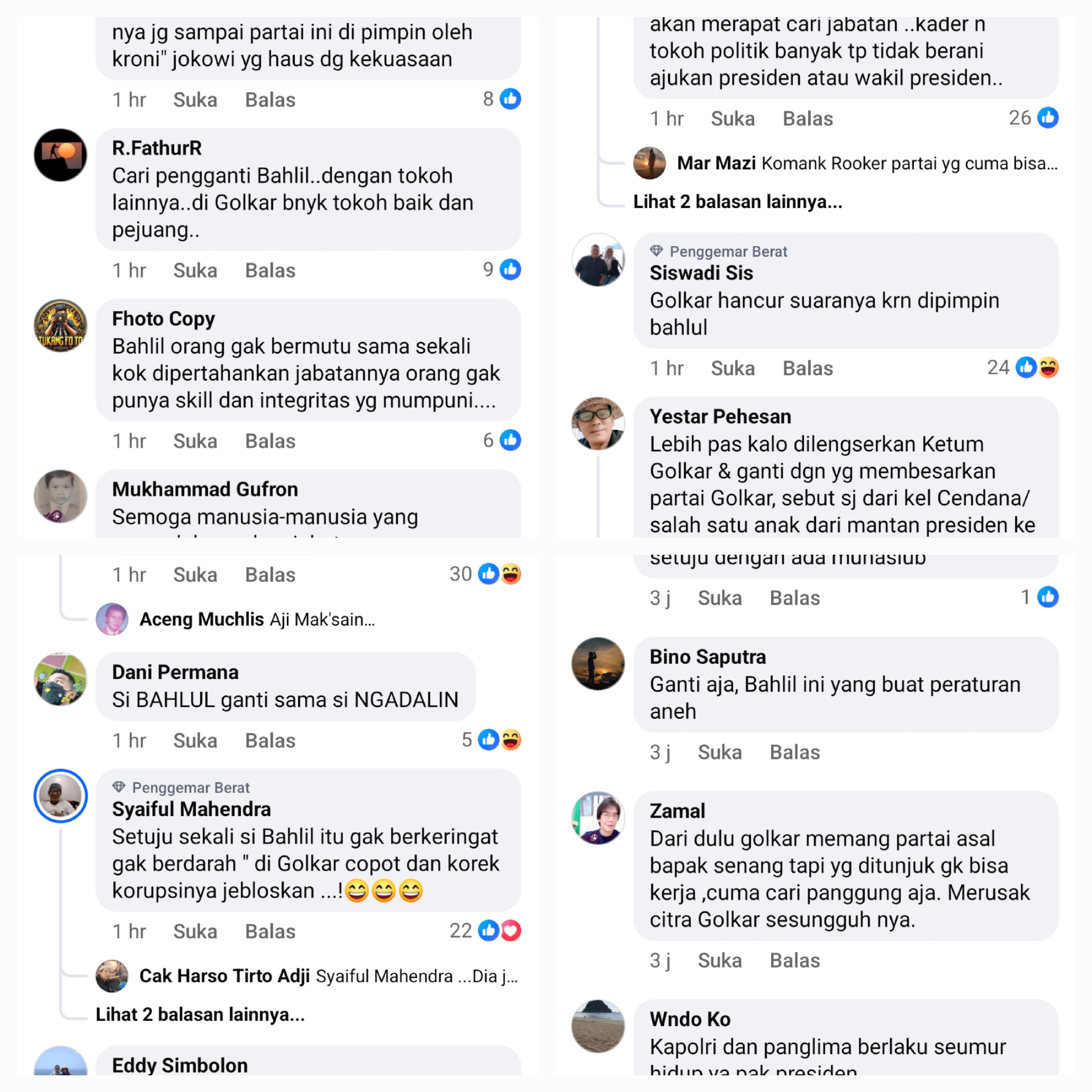 Salah satu komentar dari akun Nier Purwanto menyebut, “Segera dilengserkan Bahlil dari Ketum Golkar supaya kepercayaan rakyat kepada Golkar tidak surut.” Komentar ini disambut dukungan serupa dari warganet lain seperti Pramono Boedy Bambang yang menulis, “Aamiin. Buruan ganti ketua Golkar…!! Kayak kurang kader TOP aja nih partai.”